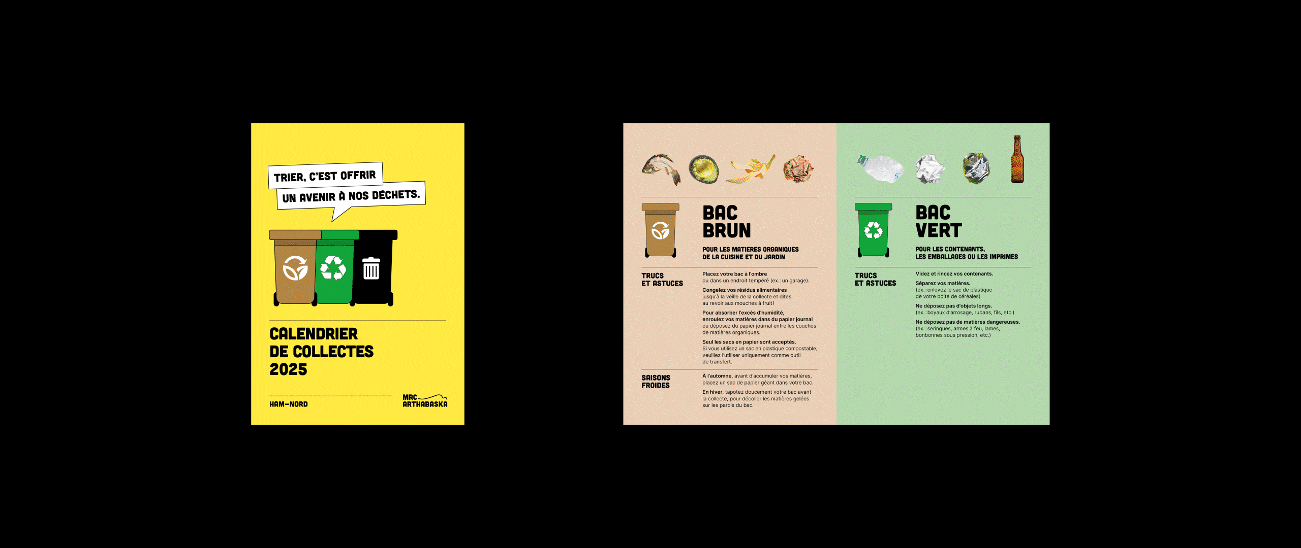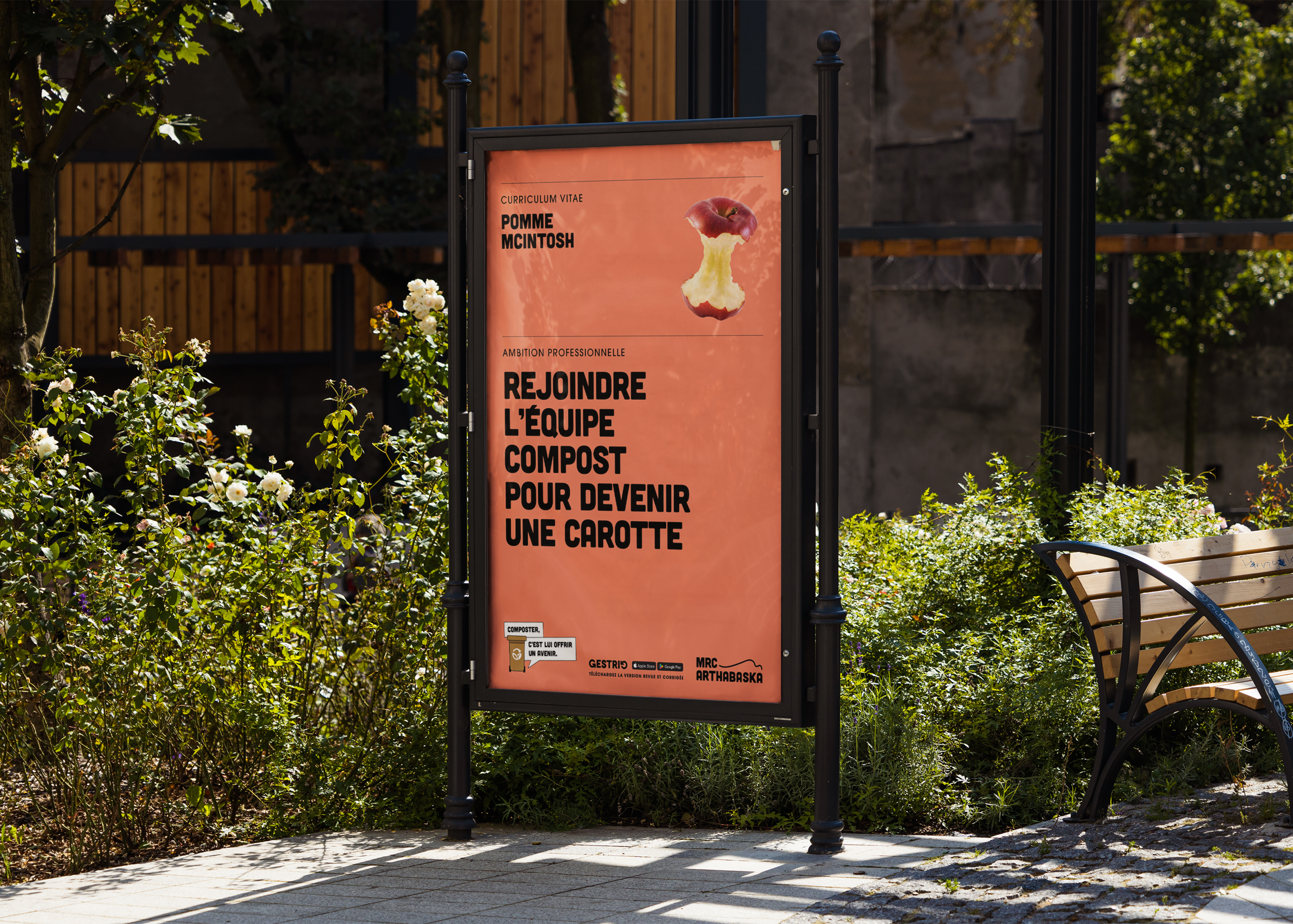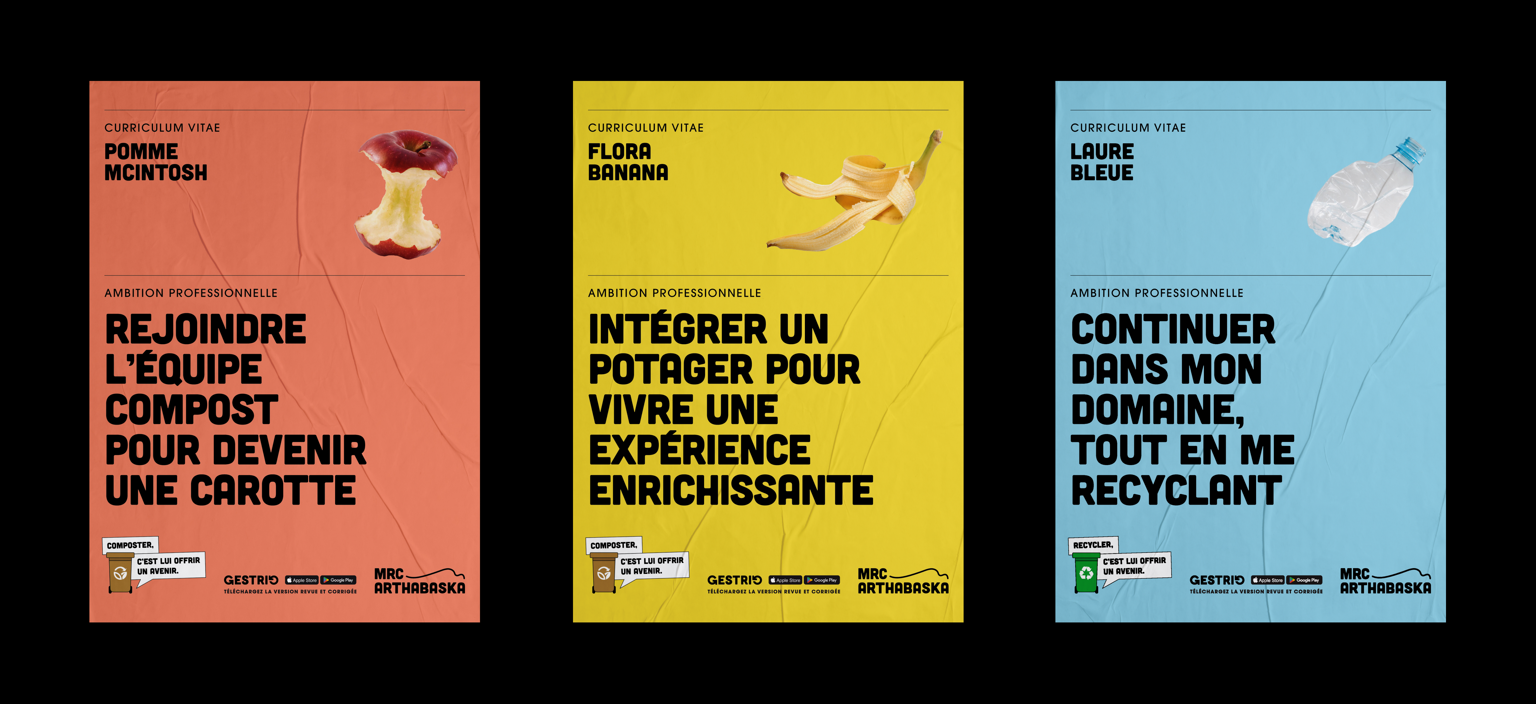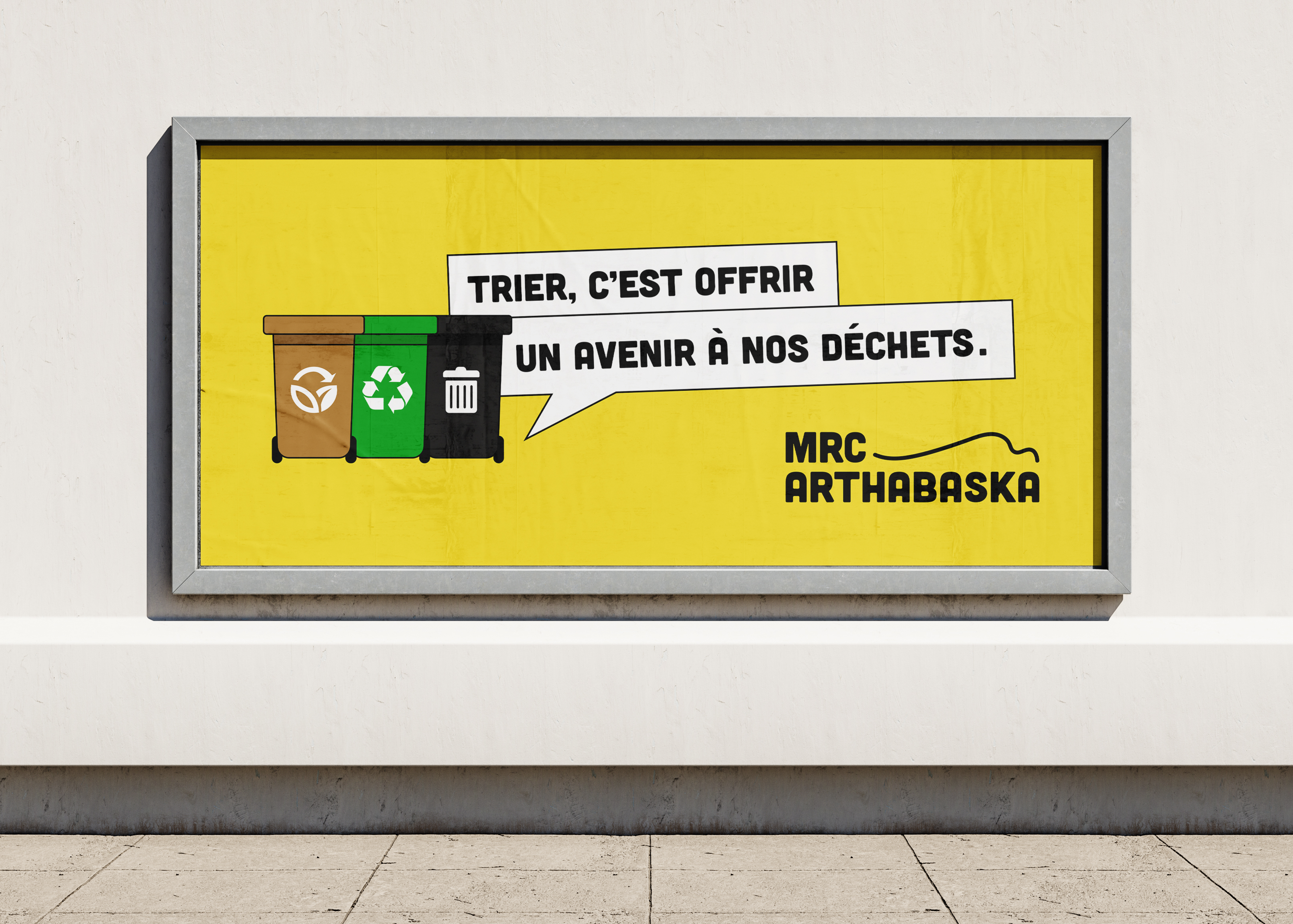 La MRC d’Arthabaska s’est donné pour mission de réduire la quantité de déchets enfouis en encourageant une meilleure utilisation des bacs à matière organique et recyclable. Pour atteindre cet objectif, Beauvoir a créé une campagne aussi ludique qu’éducative, qui mise sur l’humour pour sensibiliser les citoyen.nes à l’importance du tri. Cette initiative s’adresse principalement aux citoyen.nes de la région, avec une attention particulière pour les jeunes adultes nouvellement responsables de la gestion de leurs bacs.