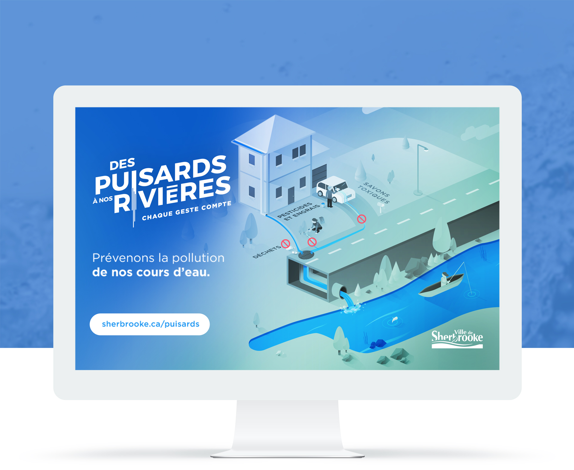 La Ville de Sherbrooke souhaitait sensibiliser sa population à l’importance de la protection de ses cours d’eau. Elle nous a donc mandatés pour réaliser l’identité d’une campagne visant à encourager les gestes réfléchis.