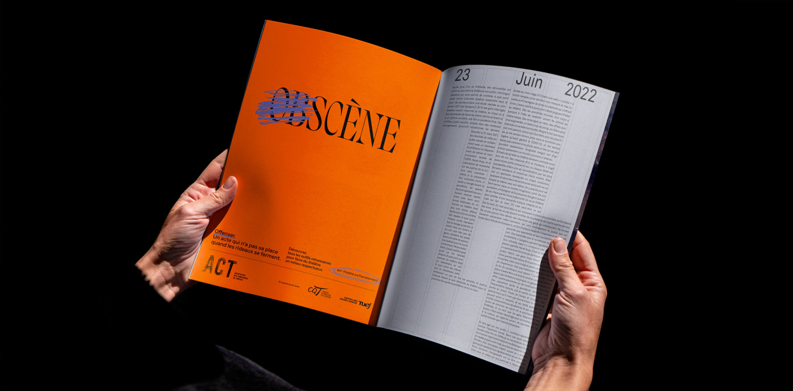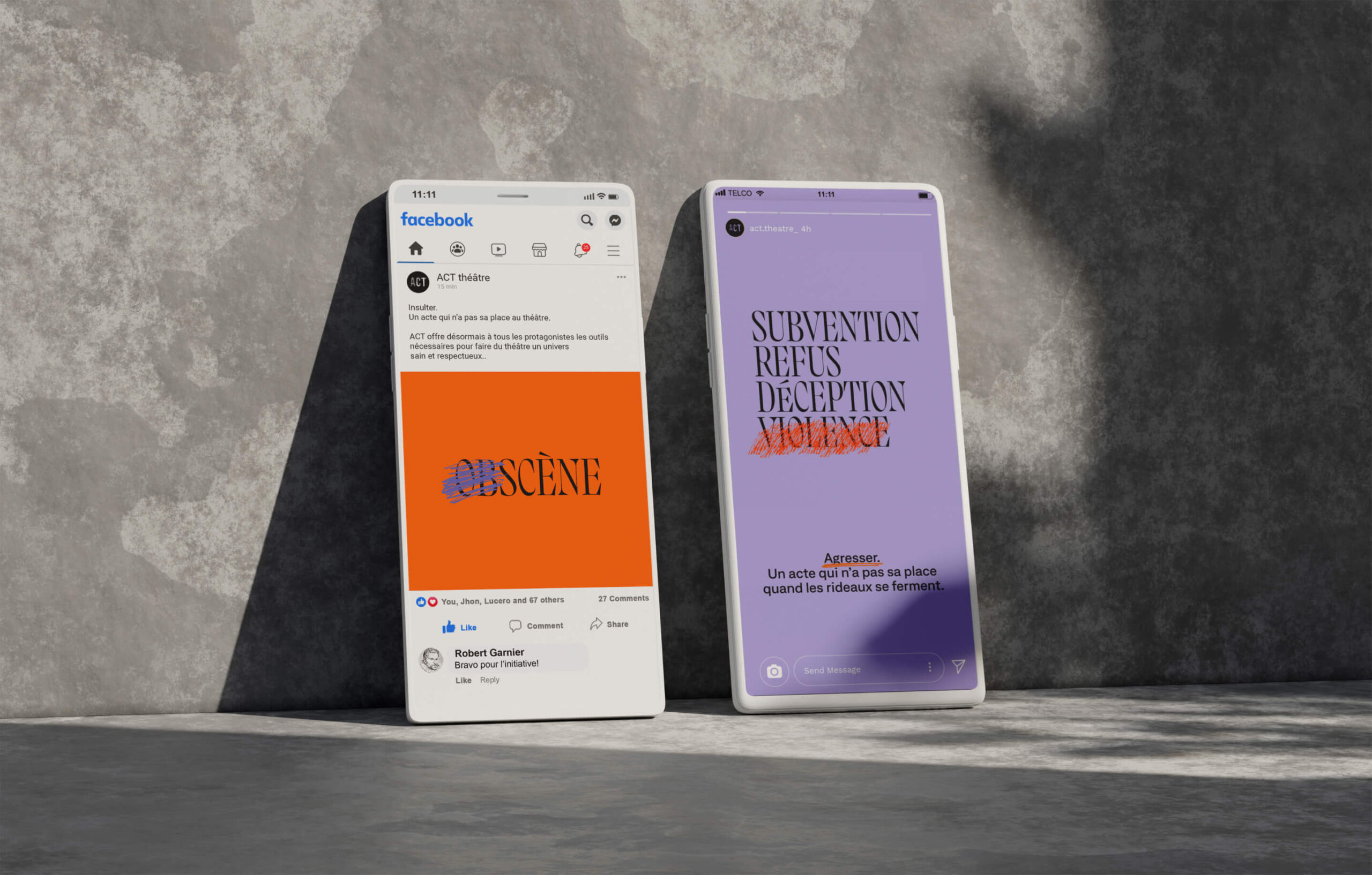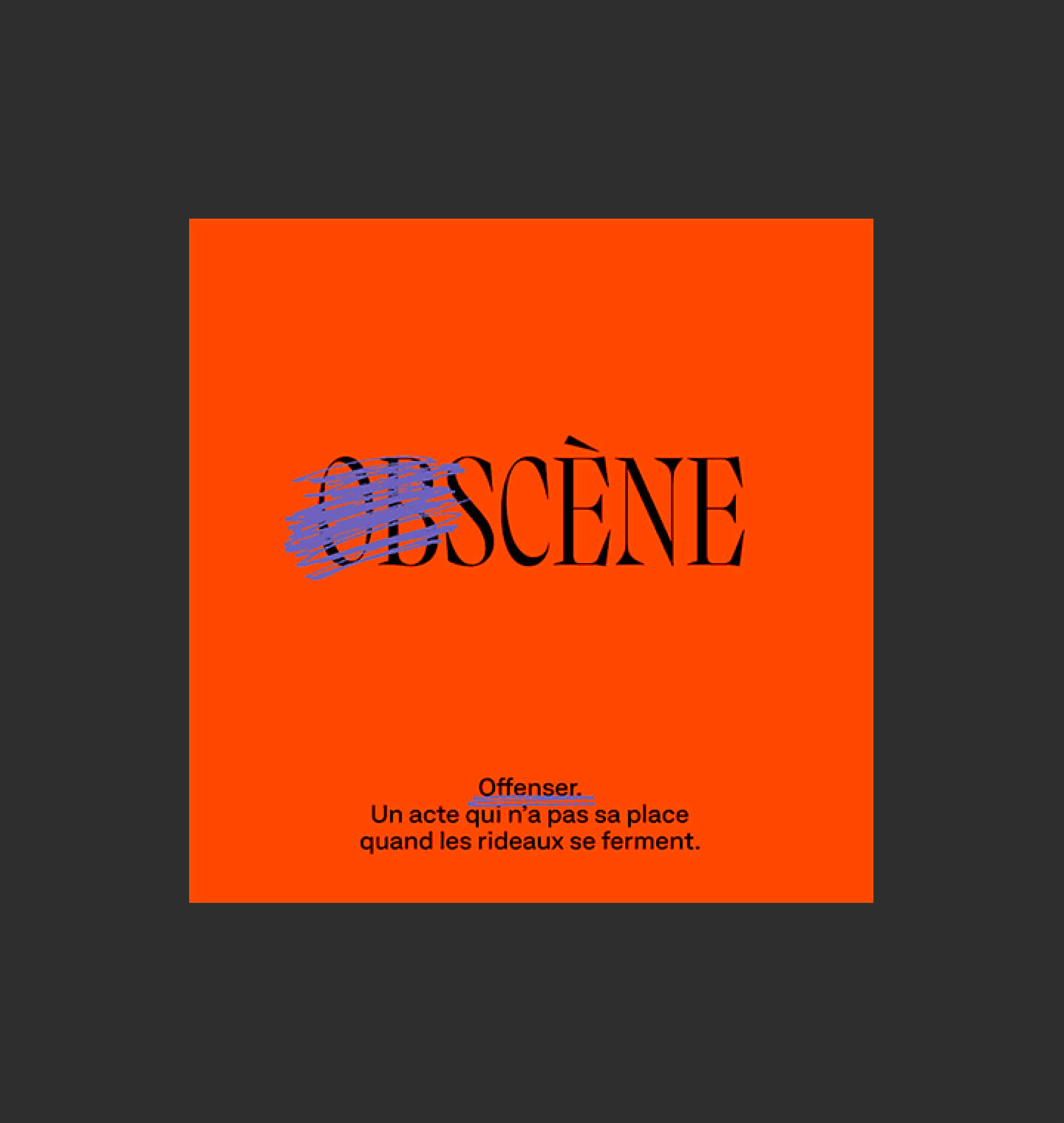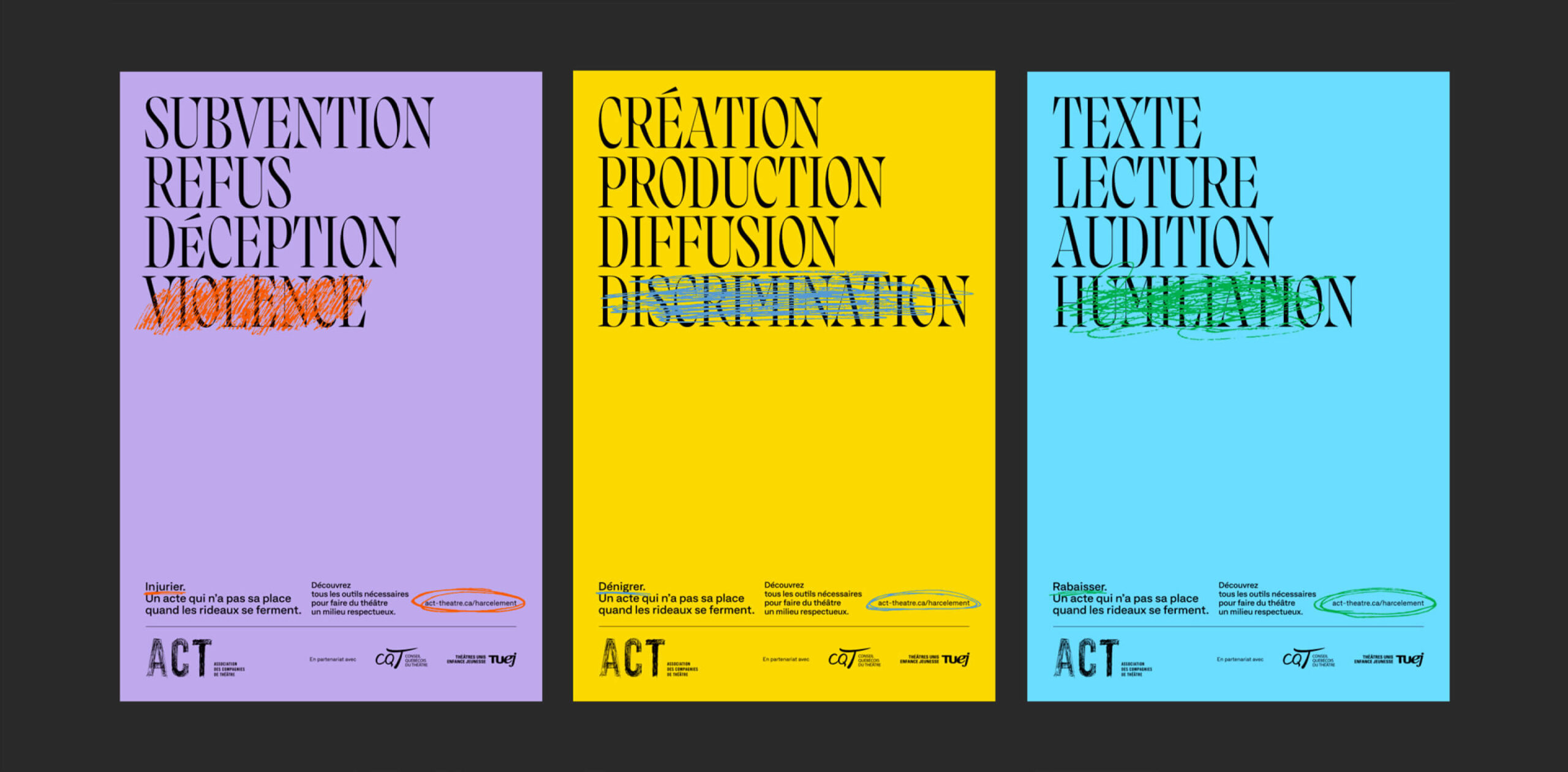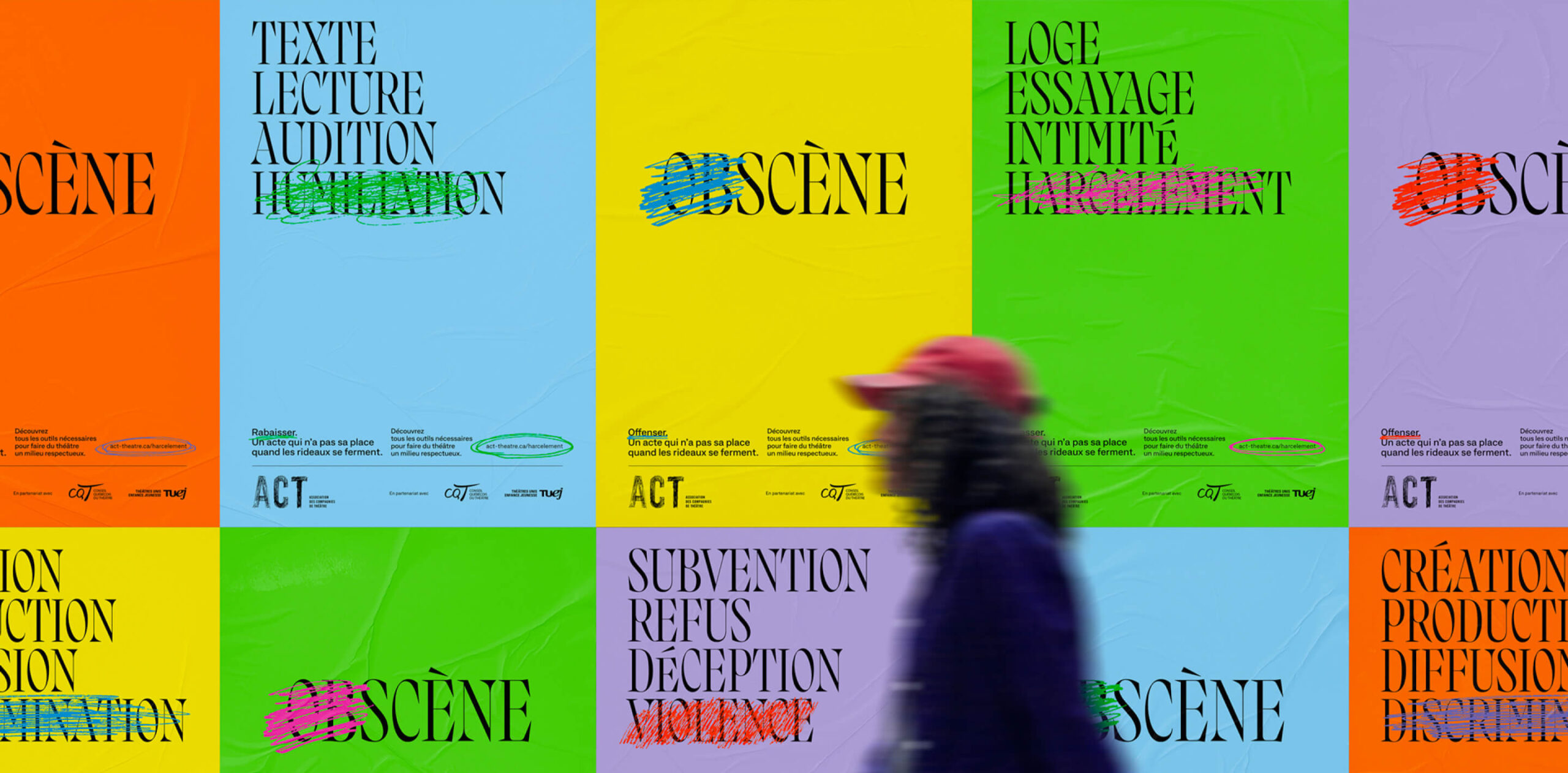 To meet ACT’s objectives, Beauvoir elaborated an impactful campaign making use of theatre’s raw material—text. To support the impactful written content, we developed the graphic universe with theatrical codes (typography, strikethroughs) and injected these with a dose of brutality, consistent with the topic. Bright colours add a sense of balance to the equation and make this campaign unique.