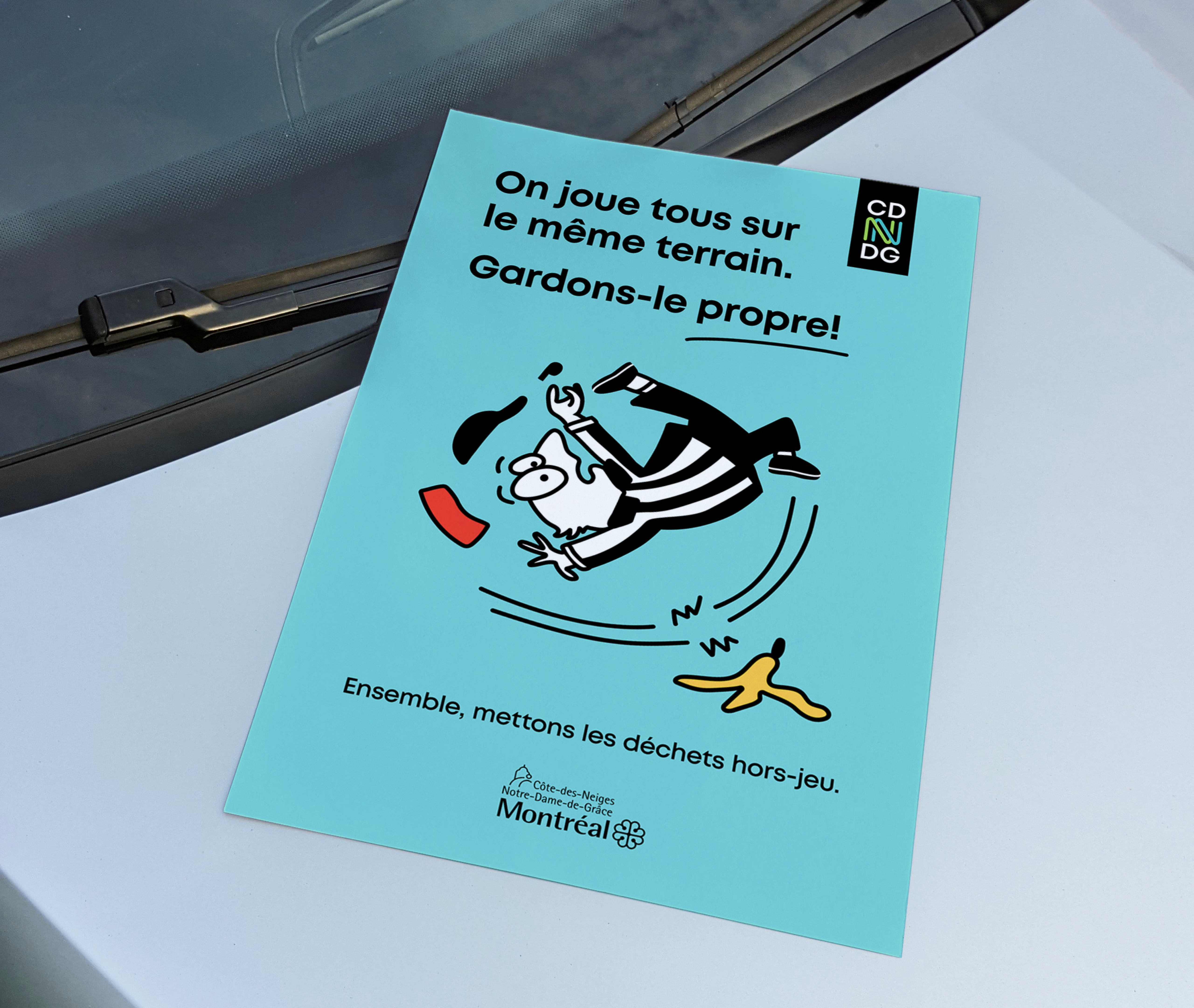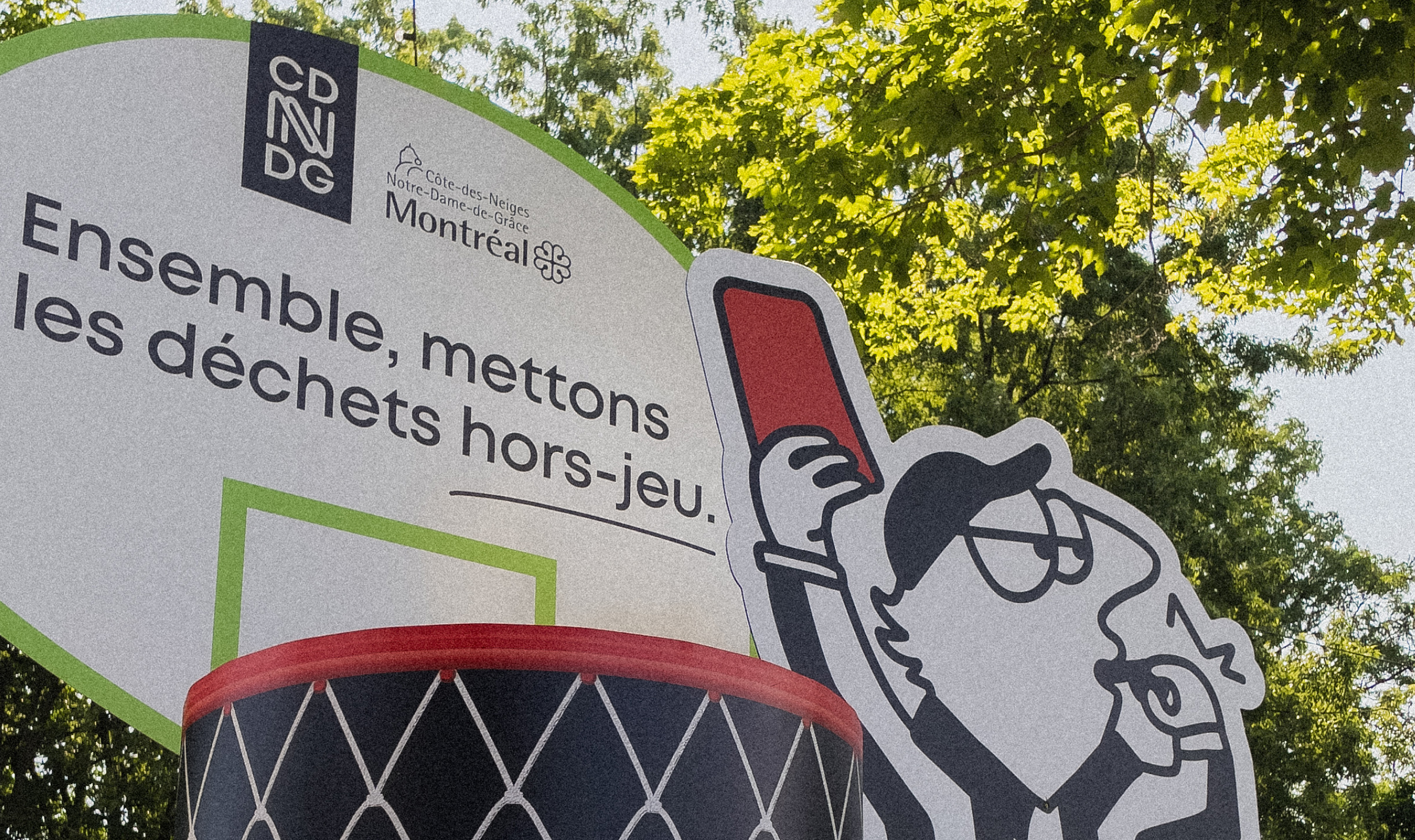 The humorous adventures of this character were featured on posters in borough parks, commercial streets, and street-sweeping trucks, while also making a splash on CDN–NDG’s social media platforms. A themed trash bin was even created to promote the campaign at the borough’s summer events, ensuring the message reached residents and visitors alike.
