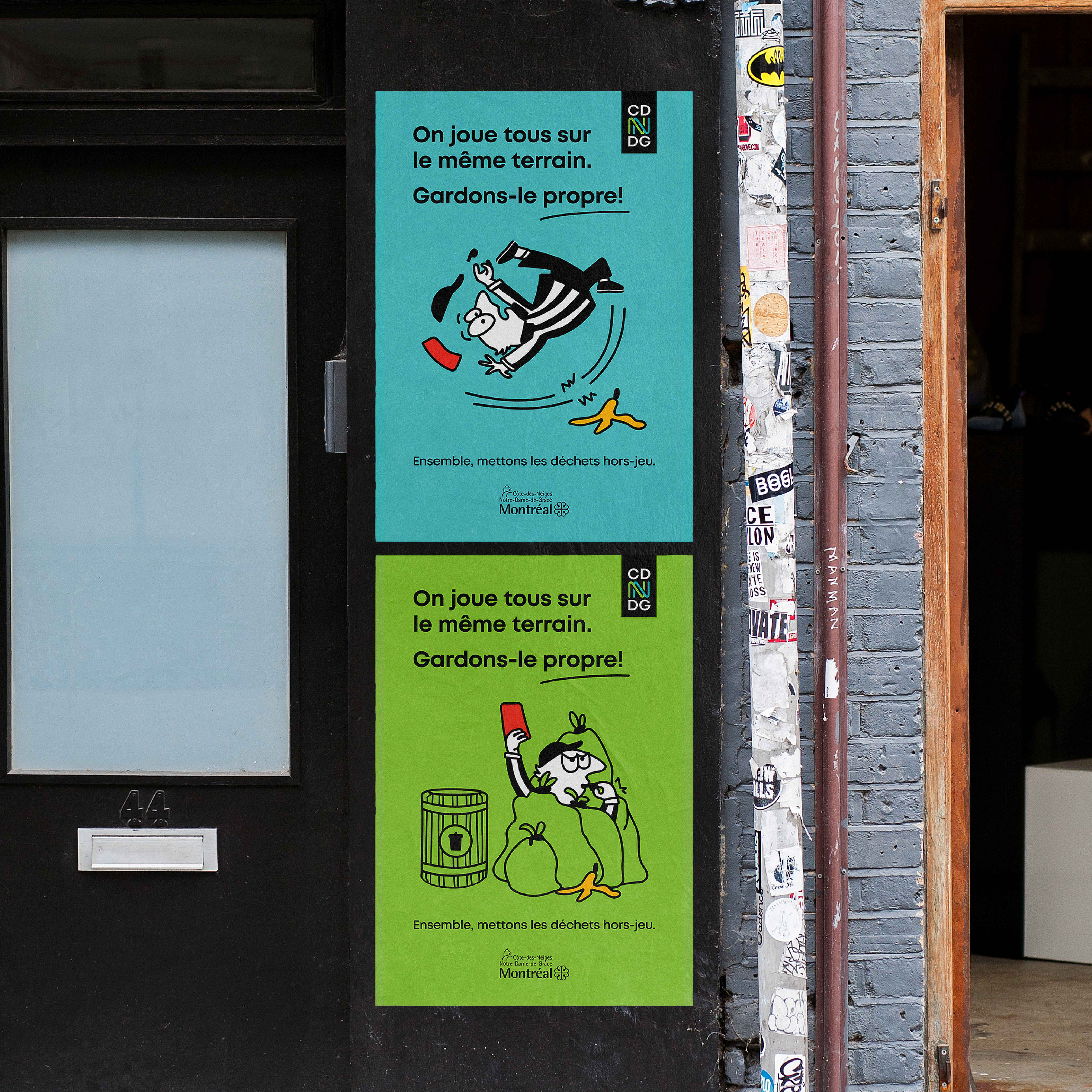 In the summer of 2024, the borough of Côte-des-Neiges–Notre-Dame-de-Grâce set out to launch a communication campaign emphasizing the importance of respecting urban cleanliness rules. To achieve these goals, Beauvoir designed and executed an illustrated campaign where the theme of sports quickly became a natural choice. This approach allowed the campaign to unite the community, draw on universal references to connect with a diverse population, and establish a rich visual language.
