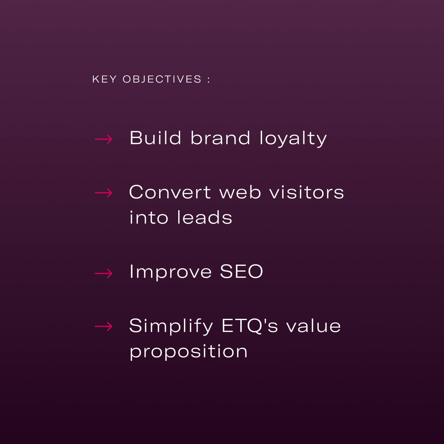 ETQ, a tech company that provides its clients with a world-class quality management software (QMS), mandated Beauvoir for a company rebrand and website overhaul after a change in management. By developing a strong storytelling that succeeds in engaging prospects from various industries and company sizes, and by guiding them on the path to purchase through efficient UX and design, Beauvoir rose to the challenge.