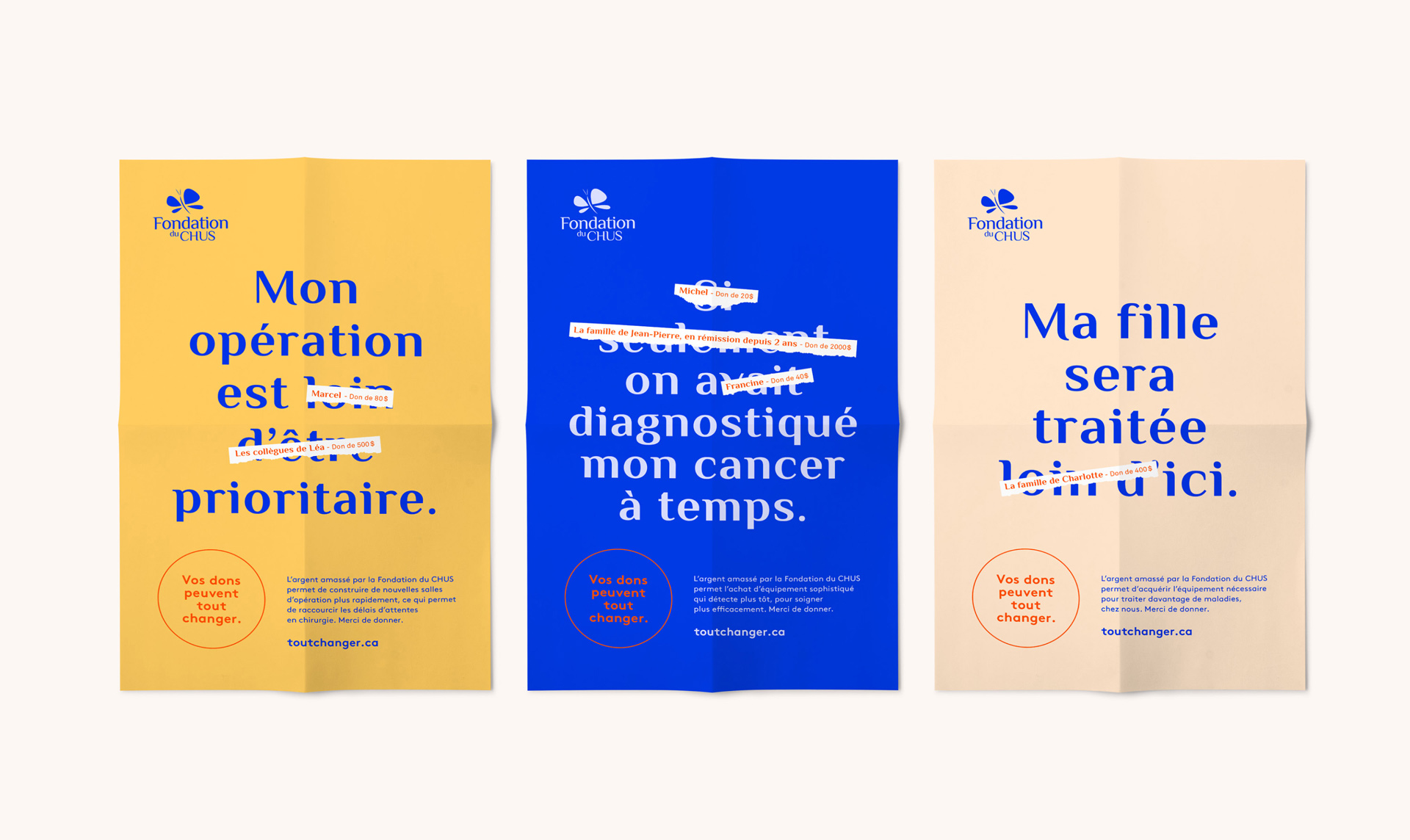 Pour sa nouvelle campagne, la Fondation du CHUS nous a confié trois objectifs : informer la population sur l’impact concret qu’elle a sur notre système de santé , remercier ses donateurs actuels et solliciter la contribution de nouveaux donateurs. Pour y arriver, nous avons utilisé des angles différents en imprimé et en vidéo pour illustrer une même grande idée : petit ou grand, chaque don peut apporter un grand changement.