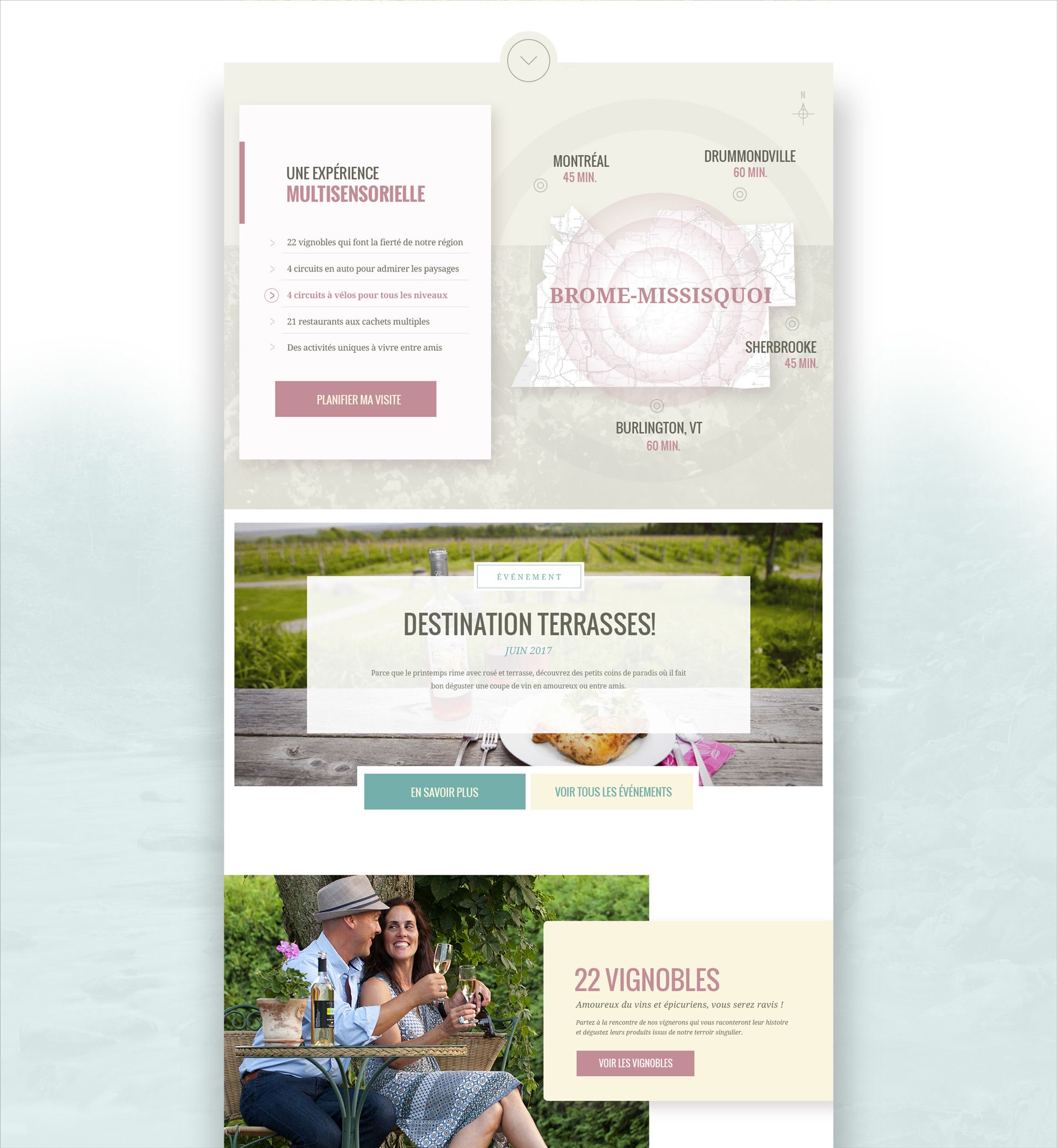 Partenaire de longue date de Beauvoir sur multiples mandats numériques, le CLD Brome-Missisquoi nous a mandaté pour créer un microsite mettant de l’avant l’expérience des visiteurs, vécue en parcourant les différents circuits de la Route des vins. L’objectif principal: maximiser le potentiel de promotion de son terroir et attirer les visiteurs à découvrir la région par le biais des vignobles membres fièrement représentés.